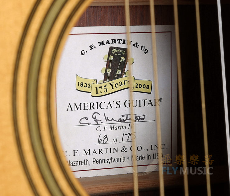 美国吉他第一百七十五周年纪念版是为了纪念马丁吉他175年传承的经典吉他技艺。全球限量175只。这只漂亮吉他的声学特征使用阿迪朗达克云杉来做成面板,并且使用坚实的马达加斯加玫瑰木作为背侧板,并且使用火焰相思木的包边。声音的反应非常迅速和明快,前置X型斜切音梁,也让声音通透远达。