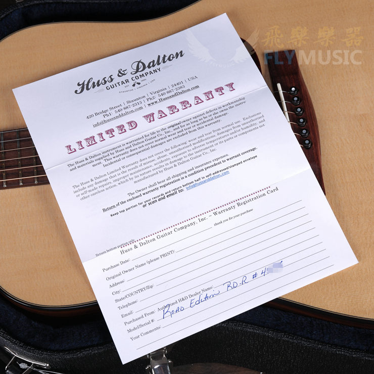 所有Road系列吉他都在同样的工作室,由同一批Huss&Dalton制琴师制作,并坚持使用Adirondack音梁进行制作,在音色和品质上没做任何妥协。与标准款不同是,Road Edition的琴颈背侧板使用了哑光漆面,并取消了一些装饰性的配置,达到了缩减成本,降低价格的目的。如今Road Edition依然被许多乐手所喜爱,随着经济环境逐渐缓和,Huss&Dalton为这个系列配备了更高档的TKL琴盒,让享受高端定制箱琴成为了可能。